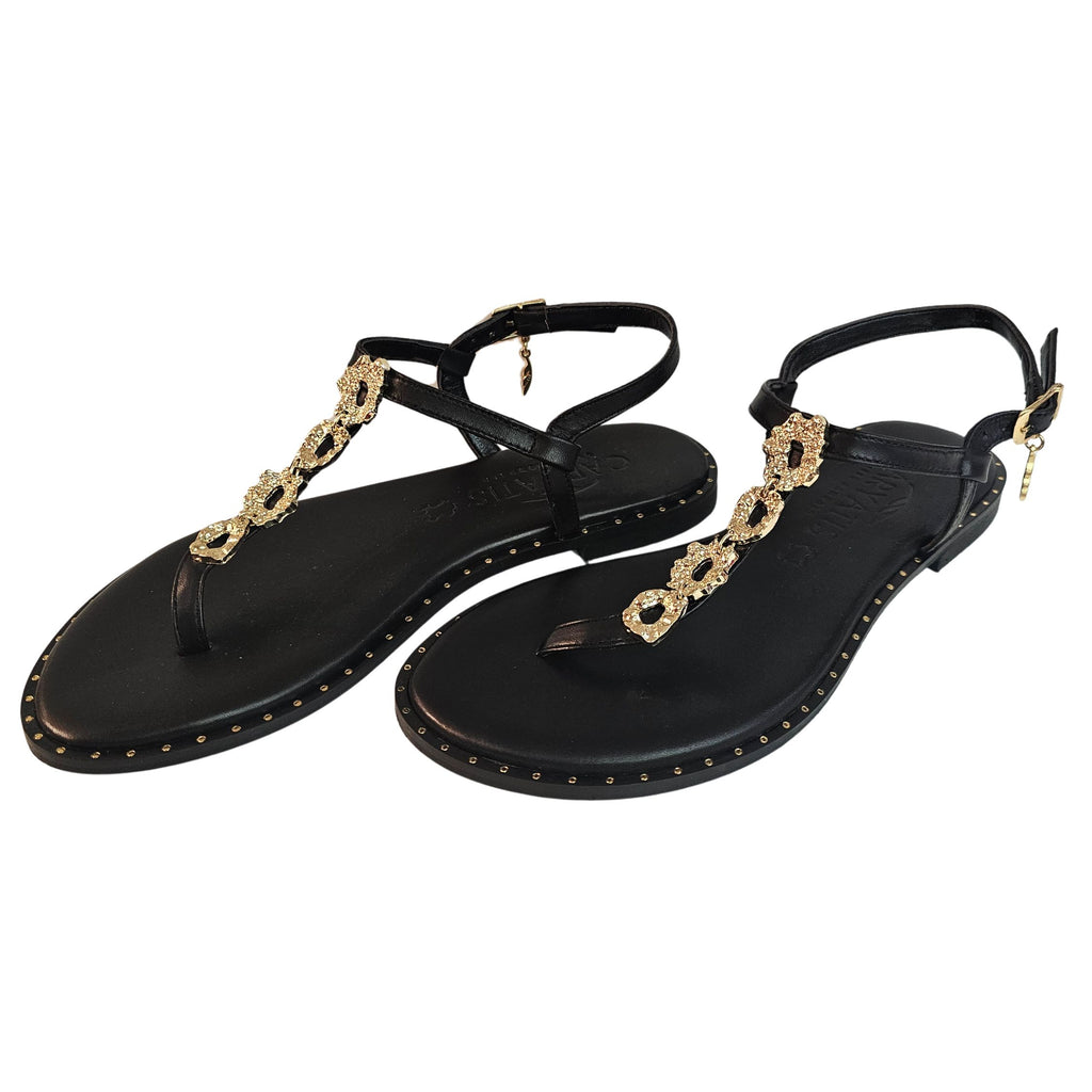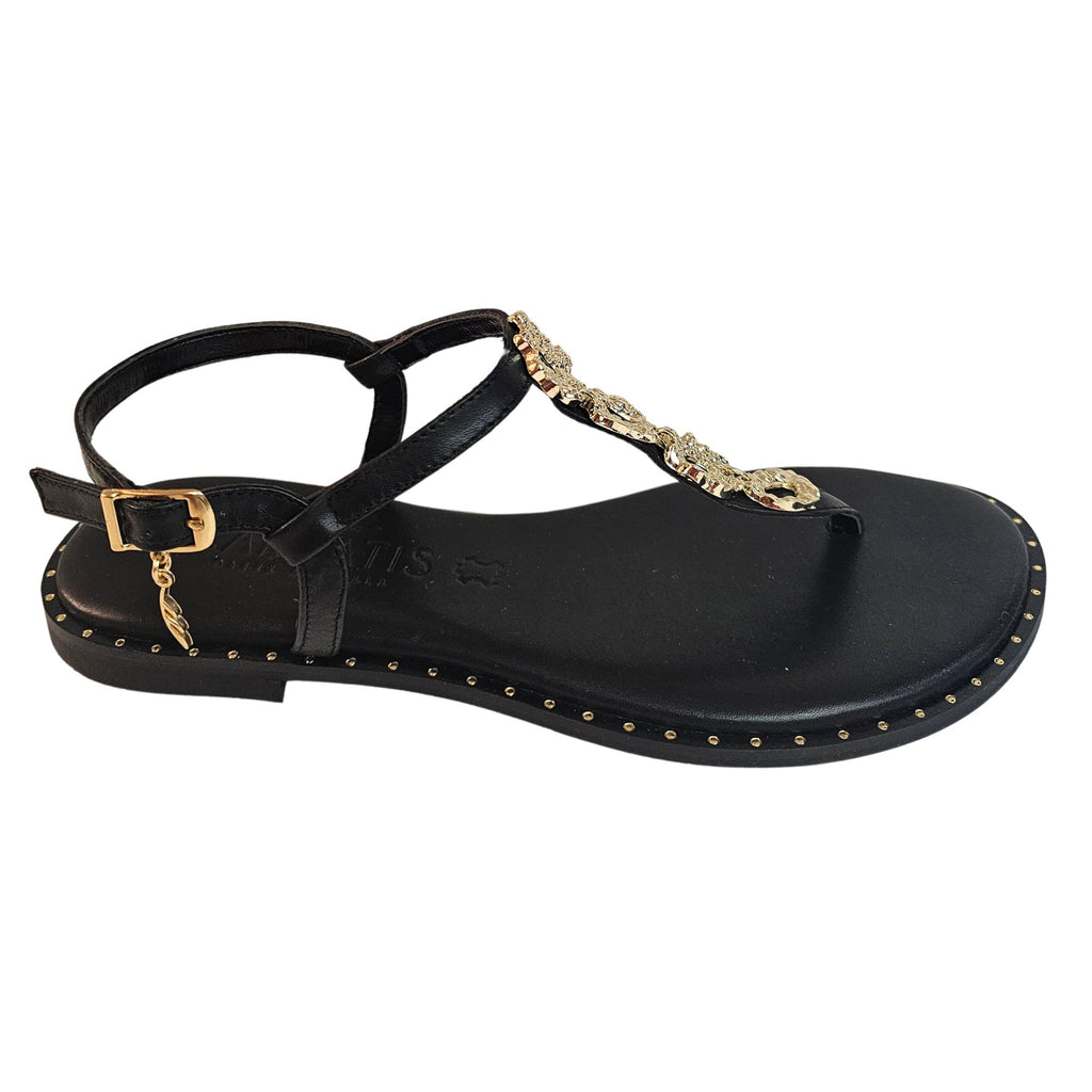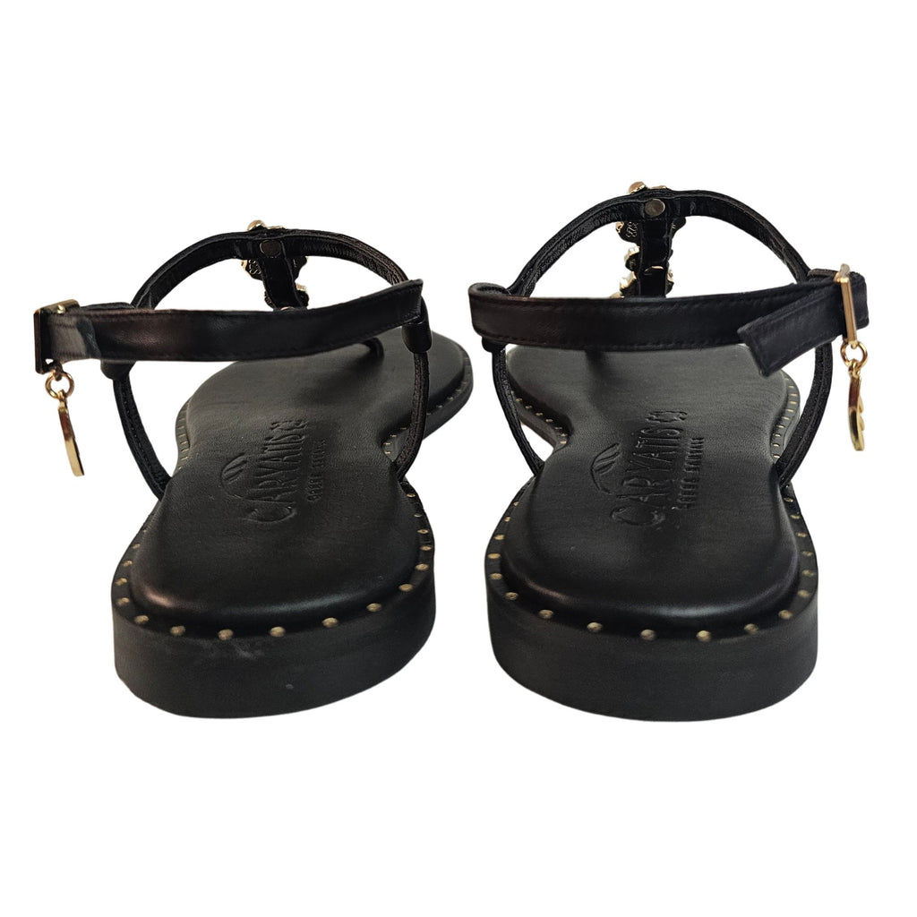 Caryatis, Zehenteiler Sandale in Schwarz mit Golddetails