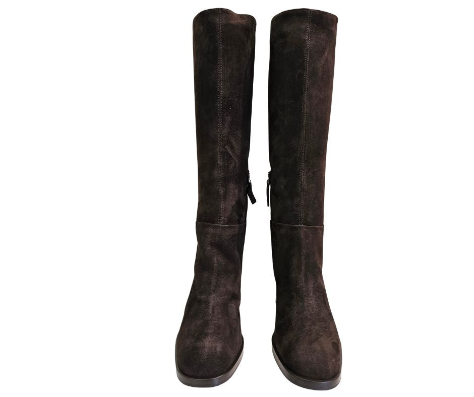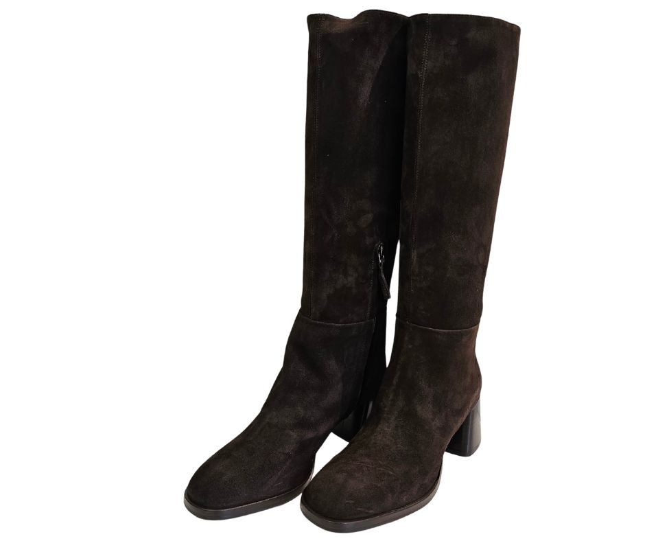 Der dunkelbraune Wildlederstiefel ist mit seinem komfortablen Blockabsatz genau richtig zu der Mode. Er ist zeitlos schön.